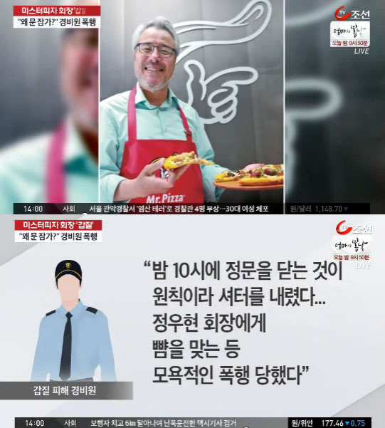한편 서울 서대문경찰서는 미스터피자를 보유한 유명 외식업체 MPK 그룹의 정우현 회장이 경비원을 때린 혐의로 출석을 요구했다고 4일 밝혔다.