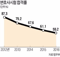 변호사시험(변시) 합격률이 올해 처음으로 50%대로 떨어졌다. 법학전문대학원(로스쿨)과 학생들의 한숨이 깊어지고 있다.법무부는 제5회 변시에 응시한 2864명 중 1581명(55.2%)이 합격했다고 21일 발표했다. 제5회 시험에 처음 응시한 로스쿨 5기생은 1666명 가운데 1212명(72.75%)이 합격했다. 성별로는 남성이 939명(59.39%), 여성이 642명(40.61%)이었다. 작년보다 여성 숫자가 30명 줄고 비율도 2.33%포인트 낮아졌다. 합격자 중 58.57%(926명)는 법학을 전공했다.