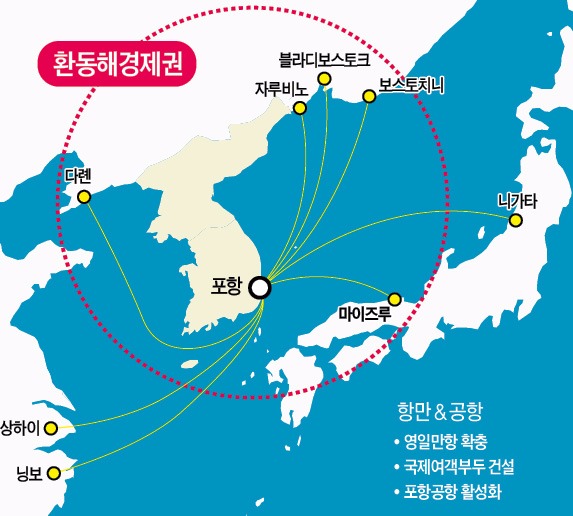 포항시는 2014년부터 환동해권의 경제 주도권을 잡기 위한 전략을 추진하고 있다. 환동해권은 한반도 동해안, 일본 서해안, 중국 동북3성과 러시아 극동지역을 포함하는 글로벌 경제벨트다. 인구가 1억6000만명에 달해 성장 가능성이 큰 지역이지만 각각 자국의 변방에 자리 잡아 상대적으로 낙후돼 있다. 국제부흥개발은행(IBRD)은 2020년에는 국내총생산(GDP) 기준으로 환동 挽?중심으로 한 동북아 경제권이 세계 경제의 26.6%를 차지해 유럽과 북미에 이은 세계 3대 경제권역이 될 것으로 전망했다.