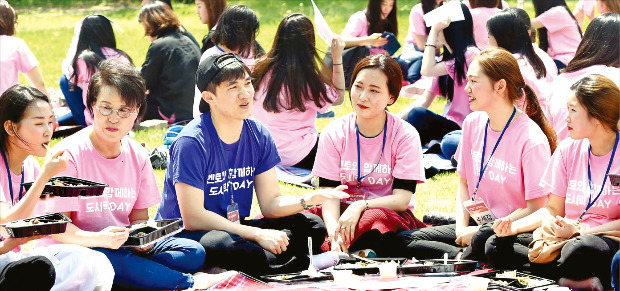 서울여대의 취업 지원 프로그램인 ‘멘토와 함께하는 도시락데이’가 12일 서울 공릉동 서울여대 캠퍼스에서 열렸다. 학생들이 도시락을 먹으며 전혜정 서울여대 총장(왼쪽 두 번째)과 선배들의 조언을 듣고 있다. 이날 행사에는 공기업, 금융권, 마케팅 등 9개 분야 현직 멘토들이 참가했다.