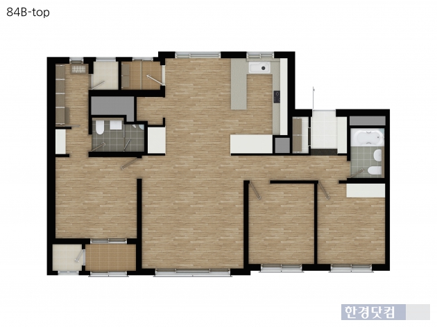 특화 설계 가구는 배다 ?徽째貶彭?인접한 동에 들어가는 전용 84㎡B다. 전체 구조는 전면에 방-거실-방-방이 배치된 4베이 판상형. 모델하우스에 마련된 유니트를 둘러보니 역시나 예상대로 주방이 특이했다.
