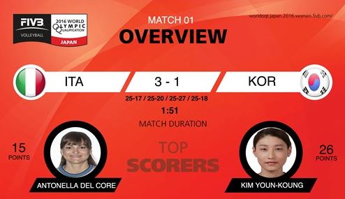한국 여자배구 대표팀은 14일 일본 도쿄에서 열린 2016 리우데자네이루 올림픽 세계여자예선 1차전에서 이탈리아에 세트 스코어 1-3(17-25 20-25 27-25 18-25)으로 패했다.