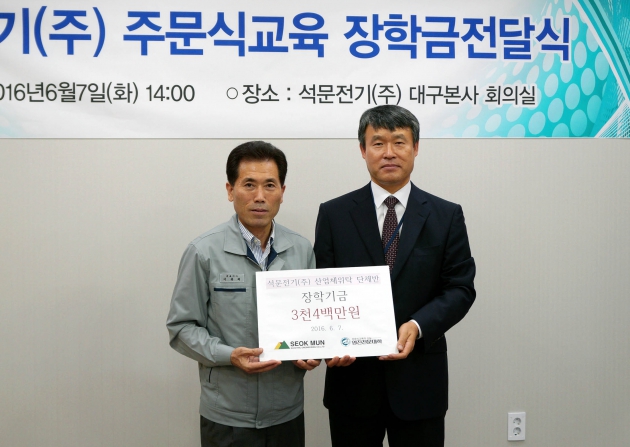 장학금을 전달한 이용재 석문전기 대표이사는 “회사의 직무와 연관된 교육을 영진전문대학에서 받게 돼 우리 사원들의 직무 능력이 크게 향상될 것으로 기대가 매우 크다"며 "특히 고졸 사원들이 주경야독으로 저녁에 교육 받는 등 열의가 대단해 사기 진작차원에서 장학금을 마련했다”고 전했다.
