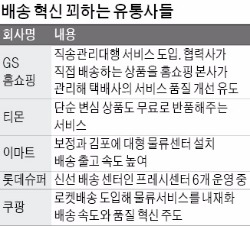 쿠팡이 시작한 배송 혁신이 유통업계 전반으로 퍼져나가고 있다. 소셜커머스 업체들은 물론, 대형마트 등 오프라인 유통업체, TV홈쇼핑회사까지 배송 서비 ?개선에 투자하기 시작했다. 소비자들의 반응도 긍정적이다.GS홈쇼핑은 수개월간의 연구 끝에 본사 물류센터를 거치지 않고 협력사가 소비자에게 직접 배송하는 ‘직송’ 부문을 개선하기로 했다. 직송 형태로 상품을 배송하는 협력사가 상품 출고 전에 출고 완료 메시지를 보내거나 반품 수거를 빨리 안 해줘 소비자가 불편을 겪는 경우가 많다는 판단에서다.