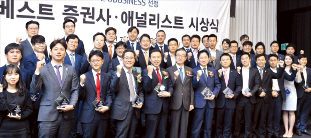 한국경제신문 자매지인 한경비즈니스가 선정한 ‘2016 상반기 베스트 증권사·애널리스트’ 시상식이 13일 서울 중림동 한국경제신문사 다산홀에서 열렸다. 하나금융투자가 처음으로 단체부문 ‘베스트 증권사’에 올랐고 리서치센터 평가에서도 1위에 올라 2관왕을 차지했다. 신한금융투자는 8회 연속 ‘베스트 법인영업팀’으로 뽑혔다. 삼성증권은 5년째 융복합 리포트 발간으로 ‘리서치 혁신상’을 받았다. 총 35개 부문에서 선정된 베스트 애널리스트들도 시상식에 참석했다. 이진국 하나금융투자 사장(앞줄 왼쪽 일곱 번째)과 이희주 한국경제매거진 사장(여섯 번째) 등이 기념촬영하고 있다.