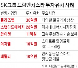 SK그룹과 대전창조경제혁신센터가 육성하고 있는 10개 벤처기업이 100억원이 넘는 투자금을 유치하는 데 성공했다. SK와 대전창조센터가 지원을 시작한 지 약 1년 만에 거둔 성과다.SK그룹은 ‘드림벤처스타 2기’가 100억원 이상의 투자금을 유치했다고 2일 발표했다. SK그룹과 대전창조센터는 지난해 9월 고유 기술을 보유한 벤처기업 10개를 드림벤처스타 2기로 선발했다. 선발한 기업에 전문적인 인큐베이팅 과정을 제공했고, 투자 유치도 지원했다. 드림벤처스타 2기가 유치한 투자 규모는 2014년 10월 출범한 드림벤처스타 1기(45억원)의 두 배다.