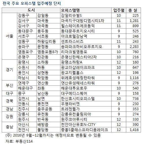 9월부터 12월까지 4개월 동안의 매월 오피스텔 입주시장은 2016년 월평균(3429실)을 웃돌 것으로 보인다. 9월은 6385실, 10월은 5476실, 11월은 3512실, 12월은 4321실이 각각 입주할 예정이다.