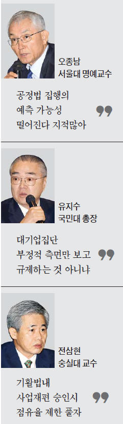 ▷유지수 국민대 총장=총수 일가가 사익편취를 한 대기업 塤騈?불공정거래가 과연 한국 경제에 얼마나 큰 피해를 줄까. 주주권익 침해 정도는 또 얼마나 될까. 3000여개의 대기업보다 350만개의 중소기업이 법을 위반했을 때 피해가 더 큰 게 아닌가. 공정위는 왜 대기업집단에만 초점을 맞추는 것인가.