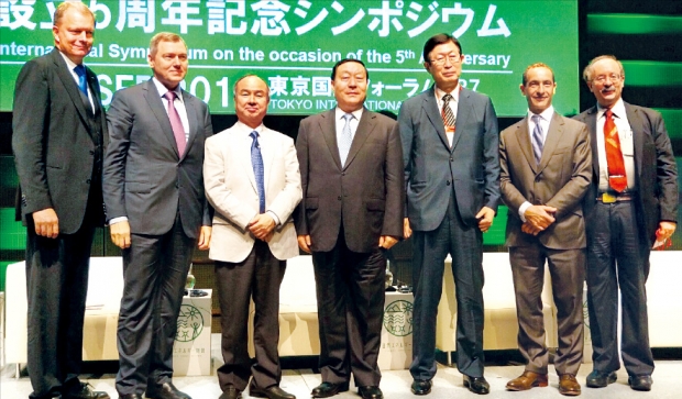조환익 한국전력 사장은 9일 일본 도쿄에서 신재생에너지재단(REI) 설립 5주년 기념 심포지엄에 참석해 손정의 소프트뱅크 회장 등과 ‘아시아 탈탄소화를 향한 에너지의 전환’을 주제로 좌담회를 했다. 왼쪽부터 토마스 코베리에르 REI 의장, 올렉 부다르긴 러시아 전력공사 사장, 손 회장, 류젠야 국제에너지상호연결개발·협력기관(GEIDCO) 사무총장, 조 사장, 마이클 리이브리히 블룸버그 신에너지 파이낸스 회장, 애머리 로빈스 하버드대 교수.