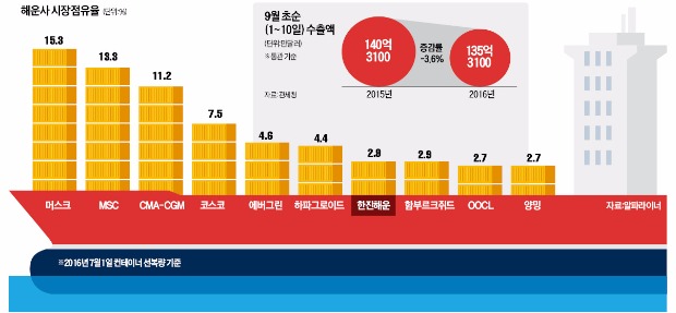 이런 가운데 수출도 불안한 모습이다. 관세청에 따르면 9월 들어 지난 10일까지 수출액은 135억3100만달러로 지난해 같은 기간보다 3.6% 줄었다. 월별 수출액은 작년 1월부터 올 7월까지 19개월째 감소하다 8월에 2.6% 증가로 반전했다. 하지만 한진해운의 법정관리로 수출 물량 운송이 차질을 빚으면서 수출이 다시 줄어든 게 아니냐는 우려가 나온다. 정부 관계자는 “작년 같은 기간보다 조업 일수가 모자란 점을 고려하면 이달 상순 수출은 오히려 플러스”라면서도 한진해운 여파에 촉각을 곤두세우고 있다.