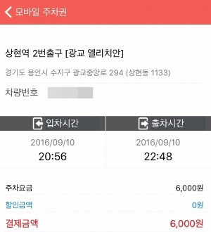 차가 다가가자 전광판엔 '아이파킹회원 6000원'이 표시되는 동시에 차단기가 열렸다. 입차 때와 마찬가지로 스마트폰에 출차와 정산이 완료됐다는 푸시 알림이 떴다. 등록된 신용카드에서 주차비가 결제됐다는 문자도 함께 들어왔다.