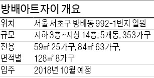 GS건설은 서울 서초구 방배동 992의 1 일원 방배3구역을 재건축해 지을 ‘방배아트자이’를 내달 분양할 예정이다. 5개동, 353가구 규모다. 이 중 조합원 몫을 뺀 96가구가 일반분양 물량이다. 전용면적별로 59㎡ 25가구, 84㎡ 63가구, 128㎡ 8가구 등 중소형 위주로 구성한다.