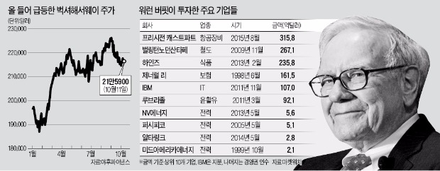 주목되는 것은 버핏이 주주들에게 적극 투자에 나서도록 종용을 받거나 배당을 하라는 식의 압력은 받지 않고 있다는 점이다. 버핏은 1965년 벅셔해서웨이를 설립한 뒤 차등의결권 주식을 통해 확고한 지배권을 행사하고 있다. 지금까지 배당은 하지 않았다. 벅셔해서웨이 주가는 주당 21만5900달러(11일 종가 기준)로 올 들어 9% 상승했다. S&P500지수 상승률(4.5%)의 두 배에 달한다.