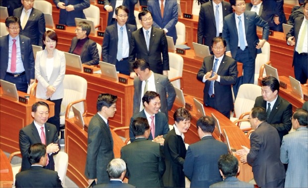 북한에 대한 강경 대응 기조도 재확인했다. 박 대통령은 “현재 한반도는 이제까지와는 차원이 다른 엄중하고 냉엄한 안보환경에 직면해 있다”며 “북한의 핵 능력 고도화 속도가 갈수록 빨라지고 있는 만큼 국회의 예산 심의 과정에서 핵심 전력과 유사시 필요한 사업의 예산이 추가 반영될 수 있도록 적극적인 관심과 협조를 부탁드린다”고 요청했다. 박 대통령은 “북한은 김정은 정권 들어 세 차례나 핵실험을 감행해 핵실험 단계를 넘어 핵무기 단계로 진입하려 하고 있다“고 지적한 뒤 “국제사회와 힘을 모아 보다 강한 압박과 제재를 가해서 북한이 비핵화 외에는 다른 선택을 할 수 없도록 만들 것”이라고 강조했다.