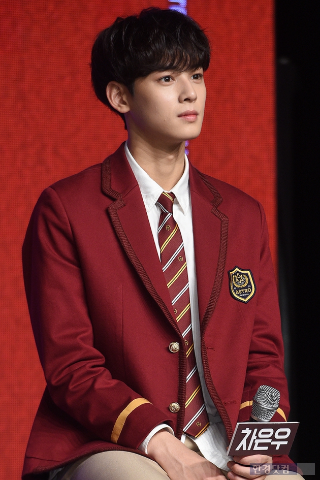 [ 최혁 기자 ] 그룹 아스트로 차은우가 9일 오후 서울 강남구 청담동 일지아트홀에서 열린 세 번째 미니 앨범 ‘어텀 스토리’ 발매기념 쇼케이스에 참석해 질문을 듣고 있다.