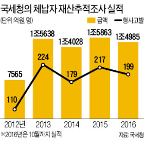 국세청은 고액·상습 체납자를 대상으로 은닉재산 추적을 강화하고 있다. 올해 10월까지 1조4985억원의 세금을 징수하거나 조세채권을 확보했다. 양도세 5억원을 체납한 김모씨는 현금 10억원을 과자상자에 담아 친척 창고에 숨겨뒀다가 덜미를 잡혔다.