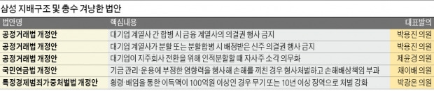 이들 법안이 통과되면 삼성은 앞으로 지주회사 전환 등 지배구조 개편과 사업 구조조정에 차질을 빚을 가능성이 높다. 박영수 특별검사팀이 이 부회장과 삼성 임원들에 대한 강도 높은 수사를 벌이는 상황에서 국회까지 새해 벽두부터 삼성을 정조준하고 있다.