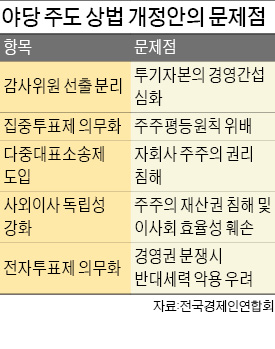 가장 큰 문제는 집중투표제와 감사위원 분리 선출이다. 새누리당과 바른정당은 신중한 입장인 반면 민주당과 국민의당은 밀어붙일 태세다. 재계는 상법 개정안 중 자산 2조원 이상 상장사에 주로 적용하는 감사위원 분리 선출과 집중투표제를 시행할 경우 기업 이사진 절반이 투기자본에 넘어갈 가능성이 높다는 우려를 내놓고 있다. 신석훈 한국경제연구원 기업연구실장은 “상법 개정안이 원안대로 통과되면 기업 이사회는 해외 투기자본의 놀이터가 될 것”이라며 “SK LG GS 등 지주사 체제 그룹은 경영권을 위협받을 가능성이 높다”고 말했다.