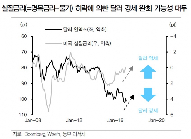강현기 동부증권 연구원은 "달러 가치는 명목금리에서 물가를 뺀 실질금리에 영향을 받는다"며 "미국 기준금리 인상 속도가 적정선을 유지한다고 가정하면, 명목금리보다는 물가가 실질금리를 좌우하는 핵심 변수가 된다"고 진단했다. 이어 "미국 물가는 트럼프 행정부가 발표하는 일련의 조치에 기초해볼 때 상승 속도가 높아질 수 있고, 이에 실질금리가 내려가 달러 약세가 유발될 것"이라고 말했다.