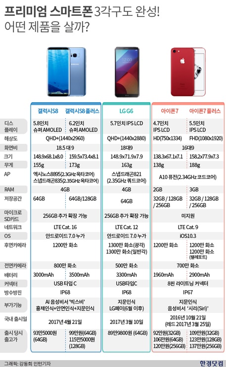 [ 이진욱 기자 ]프리미엄 스마트폰 시장이 3파전 시대를 맞았다. 지난달 30일 삼성전자 갤럭시S8이 공개되면서 LG G6, 애플 아이폰7가 주도하고 있는 시장에 가세하게 됐다.