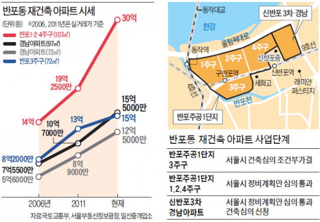 반포동은 압구정동과 함께 국내에서 가장 비싼 아파트촌으로 꼽힌다. 지난해 말 반포동 아크로리버파크 전용면적 84㎡형이 23억7000만원에 거래됐다. 3.3㎡당 7011만원꼴로 최고가 기록이다. 재건축을 추진 중인 반포주공1단지 1·2·4주구 등은 한강을 길게 끼고 있어 입지상 아크로리버파크보다 낫다는 평가를 받는다. 대형 건설사 관계자는 “반포주공1단지 1·2·4주구와 신반포3차·경남아파트는 각각 5000가구와 3000가구 이상의 매머드급 단지여서 완공 이후 한강변의 랜드마크 단지로 자리잡을 것”이라고 전망했다.