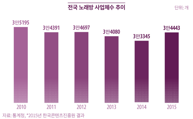 통계청 자료에 따르면 전국 노래방 수는 2010년(3만5195개)부터 2014년(3만3345개)까지 감소하다가, 2015년(3만4443개)에 들어 다시 증가했다. 전통적 노래방이 사라지는 시기에 코인노래방이 다시 증가하면서 전체 수가 증가한 것으로 추정된다.