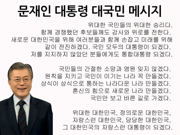 문 당선인은 "혼신의 힘을 다해 새로운 나라를 꼭 만들겠다. 국민만 보고 바른길로 가겠다"며 "위대한 대한민국, 정의로운 대한민국, 자랑스러운 대한민국, 당당한 대한민국, 그 대한민국의 자랑스러운 대통령이 되겠다"고 밝혔다.