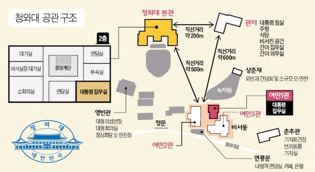 윤영찬 청와대 국민소통수석은 12일 “오늘부터 대통령이 공식적인 업무는 본관에서 보지만 일상 업무는 여민1관 3층에서 볼 것”이라고 말했다. 여민관은 노무현 정부 때 새로 지은 비서동이다. 본관과 여민관의 거리는 500m 정도다. 여민관에서 본관으로 이동하는 데는 차로 5분 정도, 걸어서는 10분 정도 걸린다. 비서관 이하는 전용차량이 없는 데다 차량 호출에도 시간이 걸려서 “보고서를 들고 뛰어가거나 자전거를 타고 갔다”(김장수 전 국가안보실장)는 증언이 과거 정부 인사들에게서 나오기도 했다.