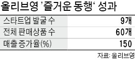 올리브영의 한 상품기획자(MD)는 한솔생명과학 측에 “제품 디자인을 간결하게 바꾸고, 20~30대 소비자가 선호하는 과일향을 주력으로 내세우자”고 조언했다. 분사가 고르게 되지 않는다는 점도 지적했다. 개선을 거쳐 작년 5월 올리브영 매대에 놓였다. 석 달 만에 매출이 두 배로 뛰었다.헬스앤드뷰티스토어 올리브영이 작년 5월 시작한 즐거운동행 프로그램이 1년 됐다. 전국 각지 중소기업을 대상으로 품평회를 연 뒤 아이디어가 돋보이는 제품을 선정해 컨설팅을 거쳐 올리브영에서 판매하는 상생 프로그램이다. 중소기업은 제품을 개선할 수 있는 조언을 얻고, 판로를 찾을 수 있다. 올리브영은 단독 판매 상품을 확보할 수 있다. 처음엔 중소기업 중에서 선발했지만 올해 초부터는 스타트업(신생 벤처기업)도 지원하고 있다. 지금까지 일곱 번의 품평회를 열어 9개 업체를 발굴했다. 초반에 15개이던 판매 상품 수도 60개로 늘었다. 즐거운동행 프로그램을 통해 입점한 제품들의 매출은 1년 새 150% 증가했다.
