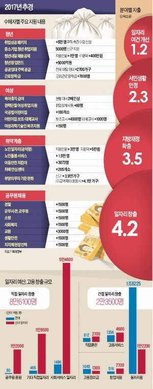 다만 중앙부처 공무원 채용 비용은 이번 추경안에 채용시험·교육훈련 명목으로 80억원만 반영됐다. 올해는 채용절차만 진행되기 때문이다. 4대 보험료를 포함한 이들의 연 인건비는 약 1200억원으로 내년 본예산에 들어간다. 대부분 민간에 위탁돼 고용되는 보육교사·대체교사·노인돌봄이·치매관리사 등 사회서비스 일자리도 2만4000개 확충한다. 노인 일자리는 3만 개 늘어나고 단가도 현행 월 22만원에서 27만원으로 높아진다. 추경안엔 이런 사회서비스와 노인 일자리 확충에 모두 1496억원이 배정됐다.민간부문 일자리 창출을 위해선 청년 3명을 정규직으로 채용하는 중소기업에 세 번째 근로자 임금을 연 2000만원 한도로 3년간 지원하는 사업이 시범 도입된다. 4차 산업혁명 관련 업종 등 성장 가능성이 있는 중소기업이 대상이다. 청년의 과감한 창업을 지원하기 위해 청년창업펀드가 5000억원으로 확대되고 ‘삼세번 재기 지원 펀드’도 3000억원 규모로 신설한다. 4차 산업혁명을 지원하기 위한 4000억원 규모의 전용 펀드도 조성한다.