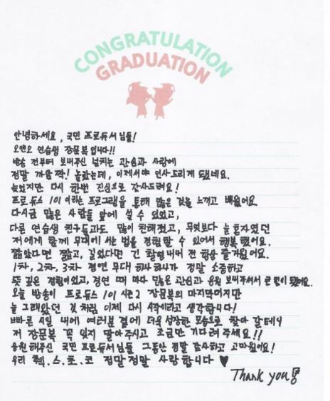 또한 "빠른 시일 내에 여러분 곁에 더욱 성장한 모습으로 찾아갈테니 저 장문복 꼭 잊지 말아주시고 조금만 기다려주세요!! 응원해주신 국민 프로듀서님들 그동안 정말 감사하고 고마웠어요! "라며 다시 한번 감사의 뜻을 전했다.