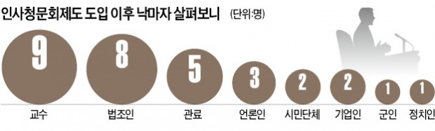 이명박 정부 초기 ‘고소영(고려대·소망교회·영남 출신) 내각’과 박근혜 정부의 ‘수첩 인사(인사가 수첩에서 나온다)’에 이어 문재인 정부에서는 ‘까도남(까도 까도 의혹이 나오는 남자) 인사’가 국정 운영의 발목을 잡는 모습이다. 새 정부 들어 안경환 법무부 장관 후보자에 이어 지난 13일 조대엽 고용노동부 장관 후보자가 낙마했다. 2000년 인사청문회 제도를 도입한 뒤 31명(인사청문회 대상 고위 공직자)이 중도 탈락이나 조기 퇴진하는 불운을 겪었다.
