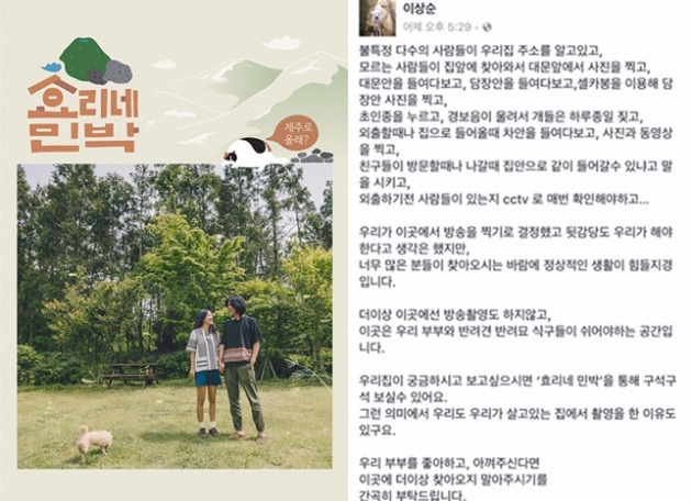 이상순은 "더 이상 이곳에선 방송 촬영도 하지 않고, 이곳은 우리 부부와 반려견 반려묘 식구들이 쉬어야 하는 공간"이라며 "우리 집이 궁금하시고 보고 싶으시면 '효리네 민박'을 통해 구석구석 보실수 있다. 그런 의미에서 우리도 우리가 살고 있는 집에서 촬영을 한 이유도 있고요"라고 덧붙였다.