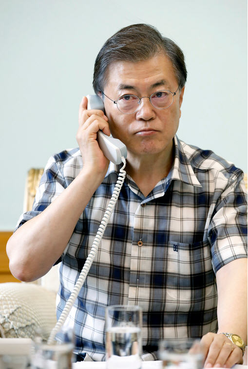 문 대통령은 휴가후 복귀한 청와대 수석 보좌관회의에서 "트럼프 대통령과 통화해 최근 한반도의 엄중한 안보 상황에 대한 인식을 공유하고 대응방안을 협의했다"며 "한·미 두 나라는 물 샐 틈 없는 연합방위 태세에 기반해 긴밀한 공조를 유지해 나가기로 했다"고 강조했다.