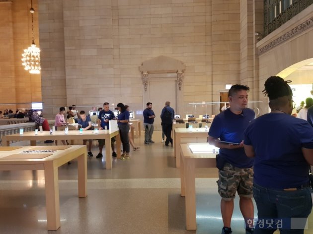 22일(현지시간) 오전 11시에 방문한 그랜드 센트럴 터미널 내 애플스토어는 애플의 까다로운 조건을 충족시킨 새로운 플래그십 매장이다. 유동성으로 따지면 따라올 매장이 없다고 해도 과언이 아니다.