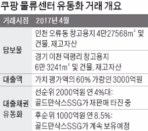 담보 자산 가치는 5000억원으로 평가됐다. 골드만SSG는 이 중 60%의 담보인정비율(LTV)을 적용해 3000억원의 대출을 집행했다. 쿠팡은 물류센터 소유권을 부동산 신탁사에 넘기고 임차료 명목으로 연 7% 이자를 지급하는 구조다.