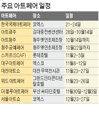 한국과 프랑스 영국 일본 등 국내외 화랑 60여 곳이 참여하는 ‘서울아트쇼’(12월23~27일·코엑스)에는 회화와 조각, 영상, 설치, 사진 등 다양한 분야에 걸쳐 300여 명의 작품 2000여 점이 걸린다. 이 밖에 청주공예페어, 대구아트페어, 대전국제아트쇼, 제주아트, 청담미술제 등이 열려 미술품 1만여 점을 쏟아낸다.