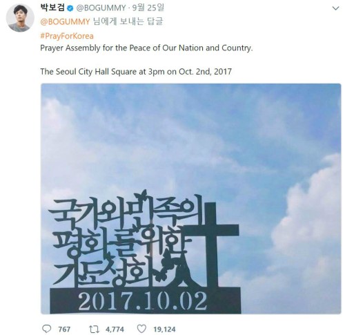 최근 박보검의 SN(소셜네트워크서비스) 계정에는 “Prayer Assembly for the Peace of Our Nation and Country(국가와 민족의 평화를 위한 기도성회). The Seoul City Hall Square at 3pm on Oct. 2nd, 2017”이라는 글과 함께 사진이 게시됐다.