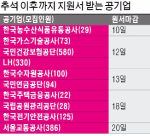 추석 이후에도 주요 공기업들이 대규모 채용을 한다. 다음주까지 지원서를 받는 LH(한국토지주택공사) 등 10개 공기업은 모두 1767명의 신규 직원을 뽑는다.국민건강보험공단은 행정직 288명, 건강직 70명, 요양직 142명 등 580명을 채용한다. 건강보험공단에서 4개월 이상 인턴 근무자는 별도 경쟁을 통해 채용한다. LH도 일반·고졸 공채를 포함해 330명의 신입직원을 선발한다. 올 상반기 212명을 뽑은 LH는 올 한 해 동안 542명을 뽑아 출범 이후 최대 규모 채용을 한다. 한국전기안전공사는 125명의 신규 직원을 모집 중이다. 신입직 합격자는 내년 1월15일부터 6월14일까지 5개월 인턴 후 정규직으로 전환된다.
