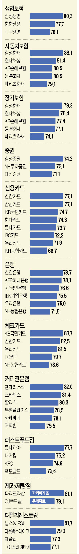 인공지능(AI)과 딥러닝 기술을 활용한 챗봇 도입으로 고객 응대와 상품 소개까지 디지털 금융의 새로운 패러다임을 제시하고 있는 신용카드산업의 만족도는 전년 대비 상승했다. 올해는 신한카드(역대 7회 1위)와 삼성카드(역대 11회 1위)가 공동 1위로 조사됐다. 신한카드는 전년도에 이어 7년 연속 1위로 나타났으며, 재이용 의향에서 경쟁사 대비 우수한 평가를 받았다. 삼성카드는 전반적 만족도와 요소 만족도에서 가장 높은 만족도를 보였다. 요소 만족도에서는 유익한 혜택이 많다는 점과 콜센터 서비스 요소에서 고객들로부터 높은 점수를 받은 것으로 나타났다.
