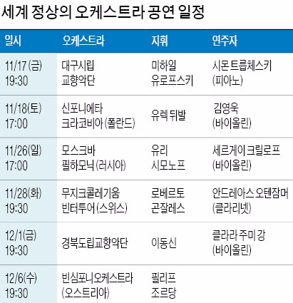 ▷11월17일(금)=대구시립교향악단이 축제의 화려한 개막을 알린다. 우리 시대의 거장 미하일 유로프스키의 지휘와 로열필하모닉소사이어티의 ‘젊은 음악가’ 상을 받은 피아니스트 시몬 트릅체스키의 협연으로 쇼스타코비치의 ‘교향곡 제5번’, 라흐마니노프의 ‘파가니니 주제에 의한 랩소디’ 등을 연주한다. ‘쇼스타코비치의 가장 뛰어난 해석자’라 불리는 만큼 생전의 쇼스타코비치와 함께 연주하며 가깝게 지내던 미하일 유로프스키만의 해석과 표현이 기대된다.▷11월18일(토)=ICMA, 에미상 등을 수상해 동유럽 최고로 평가받는 신포니에타크라코비아(폴란드)가 베토벤의 ‘교향곡 제7번’, 멘델스존의 ‘바이올린 협주곡 E 단조’ 등을 들려준다. 차세대 마에스트로로 주목받고 있는 유렉 뒤발의 지휘로 한국을 넘어 세계를 대표하는 바이올리니스트 김영욱이 협연한다.