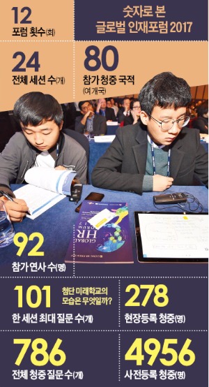 ‘글로벌 인재포럼 2017’이 사흘간의 대장정을 마쳤다. 연인원 5000여 명에 달하는 이들이 행사가 열린 서울 삼성동 그랜드인터컨티넨탈호텔을 열기로 가득 채웠다. 세계 각국에서 초청된 연사들은 한국 청중의 열의에 매료됐다. 질문이 100개 넘게 쏟아진 세션이 있을 정도다.앳된 얼굴의 고등학생들은 강연이 끝난 뒤에도 유창한 영어로 연단에서 내려온 발표자들을 에워싸곤 했다. 폴 킴 스탠퍼드대 교육대학원 부원장은 ‘아이돌’ 못지않은 인기를 누렸다.