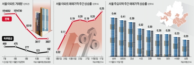 21일 서울부동산정보광장에 따르면 이날까지 11월 서울 아파트 거래량(신고일 기준)은 총 3837건을 기록했다. 하루평균 약 192건이 거래된 셈이다. 지난해 11월 하루평균 거래량(364건)과 비교하면 반토막 수준이다.