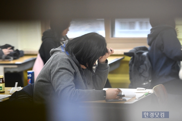 '2018학년도 대학수학능력시험'이 치러지는 23일 오전 서울 여의도동 여의도여고에 마련된 서울특별시교육청 제 13수험지구 제13시험장에서 수험생들이 마지막까지 공부를 하고 있다.