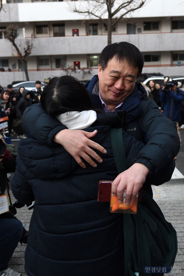 '2018학년도 대학수학능력시험'이 치러지는 23일 오전 서울 여의도동 여의도여고에 마련된 서울특별시교육청 제 13수험지구 제13시험장에서 수험생과 아버지가 포옹을 하고 있다.