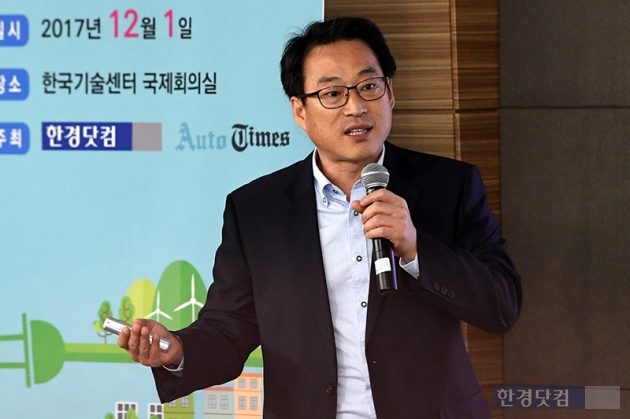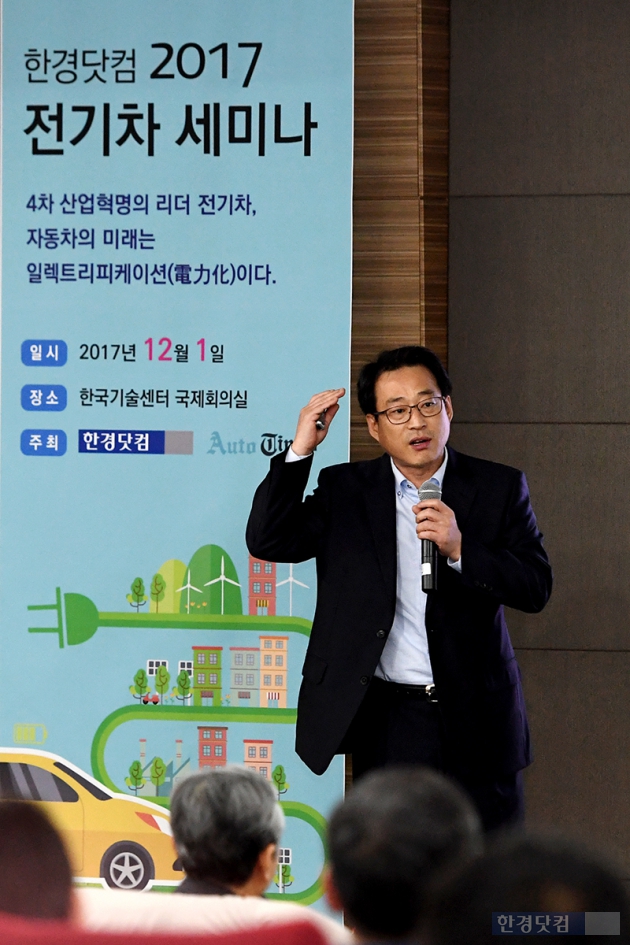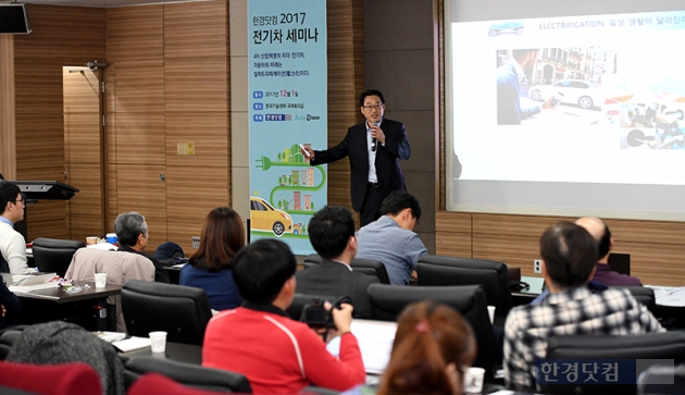 권용주 오토타임즈 편집장이 1일 오후 서울 강남구 한국기술센터에서 '4차 산업혁명의 리더 전기차, 자동차의 미래는 일렉트리피케이션이다'를 주제로 한 2017 전기차 세미나에 참석해 강연을 하고 있다.