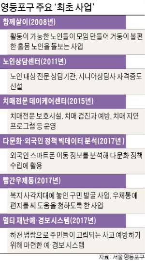 영등포구에는 ‘최초’라는 이름이 붙는 사업이 많다. 2008년 전국 최초로 도입한 ‘함께살이 사업’이 대표적이다. 사회적 활동이 가능한 노인이 거동이 불편한 홀몸노인의 말벗이 되고 일상적인 도움을 주는 사업이다. 반응이 좋아 여러 지방자치단체에서 ‘노노케어(老老CARE)’라는 사업으로 벤치마킹했다는 게 영등포구의 설명이다.
