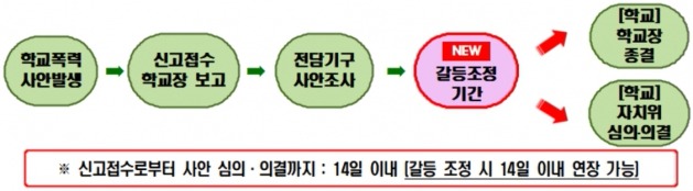 서울교육청은 갈등조정 기간을 운영해 피해·가해학생 쌍방이 동의하고 화해한 학폭 사안은 학교장이 종결 처리할 수 있게끔 하자고 제안했다. 신고하면 학폭위를 무조건 열도록 한 현행 매뉴얼이 지나치게 “법대로 하자” 식으로 흘러 학내 갈등과 분쟁이 커졌다는 현장 지적을 반영한 것이다. 단 학교장이 종결 처리하더라도 학폭위에 보고하게 해 학폭 은폐·축소를 방지하기로 했다.