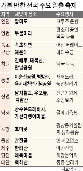 제주도는 내년 1월1일 0시부터 정상 등반이 가능한 성판악과 관음사 탐방코스에 한해 야간산행을 특별 허용했다. 도 관계자는 “안전을 위해 탐방객은 5인 1조로 그룹을 지어 등반해주길 바란다”고 말했다. 울산 울주군은 간절곶에서 ‘울주 천년을 빚다, 미래를 열다’라는 주제로 해맞이를 연다. 내년이 ‘울주’라는 이름이 지어진 지 1000년이 되는 해여서 1000개 연으로 묶은 나래 연 퍼포먼스 등을 마련했다. 경남 남해군은 창선 적량마을에서 신년 기원제를 연다. 경기 양평군은 남한강과 북한강이 만나는 두물머리에서 일출 관광객 2000여 명에게 무료로 떡국을 제공한다.