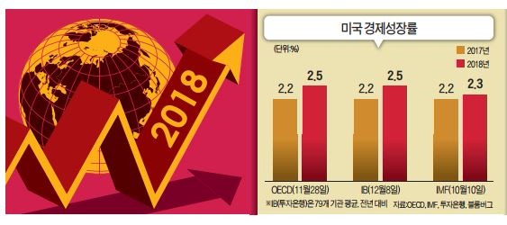 미국 경제는 온통 장밋빛이다. 지난해 3분기 국내총생산(GDP) 증가율이 연율 3.2%로 나타나는 등 성장세가 잠재성장률을 훌쩍 웃도는 수준까지 확대되고, 실업률은 자연실업률을 밑도는 4.1%까지 떨어졌다. 여기에 감세까지 1월1일 시행되면서 2018년 경기는 더 좋아질 것이란 관측이 지배적이다.골드만삭스 뱅크오브아메리카(BoA)메릴린치 등 월스트리트 투자은행들은 올해 미국 성장률은 2.5~2.6% 수준으로 지난해 2.3%(예상치)보다 더 높을 것으로 보고 있다. 글로벌 경기의 동반 회복이 이어지면서 양호한 경제 심리와 금융 여건이 유지되는 가운데 도널드 트럼프 행정부의 확장적 재정정책이 가세할 것으로 예상되고 있어서다. 앤서니 챈 JP모간자산운용 수석이코노미스트는 “올해 미국 경제성장률은 법인세 인하 등으로 연 2.5% 이상으로 높아질 것으로 본다”고 말했다.